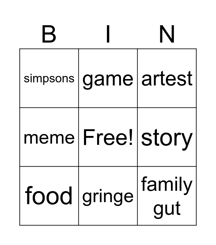 This bingo card has a free space and 8 words: story, artest, game, food, simpsons, family gut, meme and gringe.