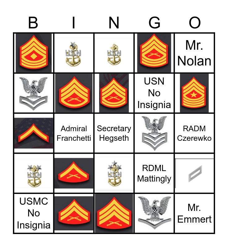 This bingo card has 20 images, a free space and 8 words: USN No Insignia, USMC No Insignia, Mr. Emmert, Admiral Franchetti, RADM Czerewko, RDML Mattingly, Mr. Nolan and Mr. Wilson.