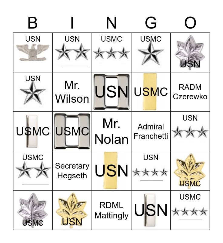 This bingo card has 20 images, a free space and 26 words: USN, USN, USN, USN, USN, USN, USN, USN, USN, USN, USMC, USMC, USMC, USMC, USMC, USMC, USMC, USMC, USMC, USMC, RADM Czerewko, RDML Mattingly, Admiral Franchetti, Secretary Hegseth, Mr. Wilson and Mr. Emmert.