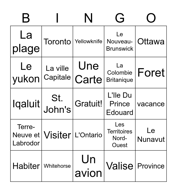 Le Canada | Le Canada | Voyageons!!! | Les voyages!!! | Franco-Ontarien Bingo