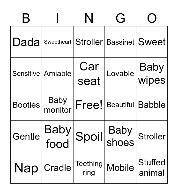 This bingo card has a free space and 99 words: Toddler, Baby Powder, Baby Oil, Stroller, Toy, Young Child, Bib, Baby Wipes, Baby Clothes, Newborn, Nursery Rhyme, Young, Kid, Spoil, mama, Dada, Sweetheart, Infant, Newborn, Toddler, Child, Diaper, Bottle, Blanket, Rattle, Stroller, Car seat, Formula, Onesie, Bouncer, Teething ring, Mobile, High chair, Swaddle, Baby monitor, Booties, Burp cloth, Changing table, Playpen, Baby food, Baby lotion, Baby wipes, Bassinet, Cradle, Cuddle, Diaper bag, Baby shampoo, Pacifier clip, Baby carrier, Nursery rhyme, Baby powder, Stuffed animal, Baby shoes, onesies, Adorable, Tiny, Innocent, Cuddly, Precious, Charming, Delightful, Playful, Curious, Sleepy, Giggly, Sweet, Joyful, Content, Newborn, Gentle, Happy, Lovable, Sensitive, Angelic, Soft, Innocent, Amiable, Laughing, Dainty, Huggable, Beautiful, Giggle, Laugh, Cry, Sleep, Nurse, Snuggle, Play, Babble, Nap, Feed, Burp, Crawl, Explore, Hug, Comfort, Wiggle, Chuckle and Grow.