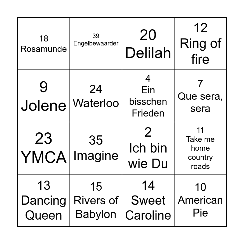 This bingo card has 40 words: 1 Atemlos durch die Nacht, 2 Ich bin wie Du, 3 Verdammt ich lieb dich, 4 Ein bisschen Frieden, 5 Du, 6 Du hast mich 1000 mal belogen, 7 Que sera, sera, 8 Singing in the rain, 9 Jolene, 10 American Pie, 11 Take me home country roads, 12 Ring of fire, 13 Dancing Queen, 14 Sweet Caroline, 15 Rivers of Babylon, 16 99 luftballons, 17 non non rien, 18 Rosamunde, 19 it´s now or never, 20 Delilah, 21 congratulations, 22 staying alive, 23 YMCA, 24 Waterloo, 25 Little green bag, 26 Mississippi, 27 Beautiful moise, 28 Living next door to Alice, 29 Green green gras of home, 30 Paradise by the dashboard light, 31 Stumblin in, 32 Stand by your man, 33 Cecilia, 34 Die immer lacht, 35 Imagine, 36 Let it be, 37 Manuela, 38 Piano man, 39 Engelbewaarder and 40 Rio.