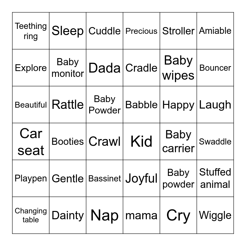 This bingo card has 100 words: Free!, Toddler, Baby Powder, Baby Oil, Stroller, Toy, Young Child, Bib, Baby Wipes, Baby Clothes, Newborn, Nursery Rhyme, Young, Kid, Spoil, mama, Dada, Sweetheart, Infant, Newborn, Toddler, Child, Diaper, Bottle, Blanket, Rattle, Stroller, Car seat, Formula, Onesie, Bouncer, Teething ring, Mobile, High chair, Swaddle, Baby monitor, Booties, Burp cloth, Changing table, Playpen, Baby food, Baby lotion, Baby wipes, Bassinet, Cradle, Cuddle, Diaper bag, Baby shampoo, Pacifier clip, Baby carrier, Nursery rhyme, Baby powder, Stuffed animal, Baby shoes, onesies, Adorable, Tiny, Innocent, Cuddly, Precious, Charming, Delightful, Playful, Curious, Sleepy, Giggly, Sweet, Joyful, Content, Newborn, Gentle, Happy, Lovable, Sensitive, Angelic, Soft, Innocent, Amiable, Laughing, Dainty, Huggable, Beautiful, Giggle, Laugh, Cry, Sleep, Nurse, Snuggle, Play, Babble, Nap, Feed, Burp, Crawl, Explore, Hug, Comfort, Wiggle, Chuckle and Grow.