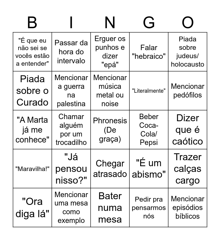 This bingo card has a free space and 29 words: "Ora diga lá", "Vamos mergulhar", Chamar alguém por um trocadilho, Trocar o nome de alguém, "É que eu não sei se vocês estão a entender", Erguer os punhos e dizer "epá", Mencionar a guerra na palestina, "Já pensou nisso?", Beber Coca-Cola/ Pepsi, Mencionar uma mesa como exemplo, Dizer que é caótico, Mencionar episódios bíblicos, Bater numa mesa, Pedir pra pensarmos nós, Mencionar pedófilos, Ter pelo menos 20 letras no quadro, Chegar atrasado, "Maravilha!", Piada sobre judeus/ holocausto, "A Marta já me conhece", "É um abismo", "Porque no fundo", "Literalmente", Piada sobre o Curado, Falar "hebraico", Passar da hora do intervalo, Trazer calças cargo, Mencionar música metal ou noise and Não cumprimentar ninguém.