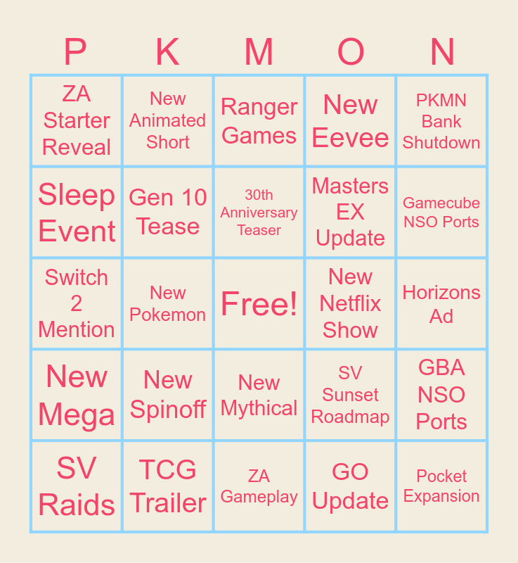 This bingo card has a free space and 24 words: New Spinoff, TCG Trailer, 30th Anniversary Teaser, SV Raids, PKMN Bank Shutdown, ZA Starter Reveal, Sleep Event, New Animated Short, New Netflix Show, New Mythical, Masters EX Update, Switch 2 Mention, SV Sunset Roadmap, GBA NSO Ports, Gen 10 Tease, GO Update, Horizons Ad, Ranger Games, Gamecube NSO Ports, New Pokemon, Pocket Expansion, New Mega, New Eevee and ZA Gameplay.