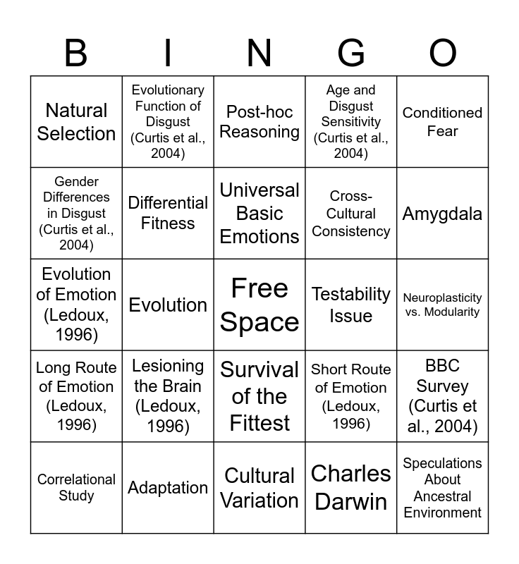 This bingo card has a free space and 30 words: Adaptation, Disgust, Evolution, Massive Modularity, Natural Selection, Post-hoc Reasoning, Differential Fitness, Survival of the Fittest, Testability Issue, Cultural Variation, Neuroplasticity vs. Modularity, Speculations About Ancestral Environment, Charles Darwin, Fear Response, Amygdala, Thalamus, Short Route of Emotion (Ledoux, 1996), Long Route of Emotion (Ledoux, 1996), Lesioning the Brain (Ledoux, 1996), Conditioned Fear, Evolution of Emotion (Ledoux, 1996), Fight or Flight, Evolutionary Function of Disgust (Curtis et al., 2004), Cross-Cultural Consistency, Gender Differences in Disgust (Curtis et al., 2004), Age and Disgust Sensitivity (Curtis et al., 2004), BBC Survey (Curtis et al., 2004), Correlational Study, Universal Basic Emotions and Environmental Pressures.