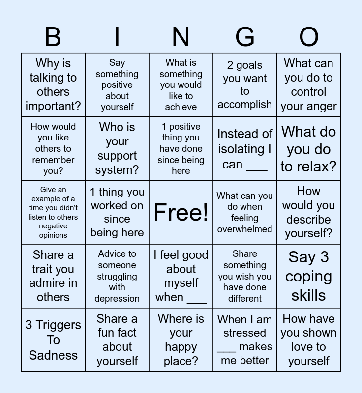 This bingo card has a free space and 25 words: 3 Triggers To Sadness, Advice to someone struggling with depression, 1 positive thing you have done since being here, When I am stressed ___ makes me better, What do you do to relax?, Why is talking to others important?, Say something positive about yourself, What is something you would like to achieve, Instead of isolating I can ___, Say 3 coping skills, Give an example of a time you didn't listen to others negative opinions, Who is your support system?, Share something you wish you have done different, How have you shown love to yourself, How would you like others to remember you?, Share a fun fact about yourself, Where is your happy place?, 2 goals you want to accomplish, How would you describe yourself?, Share a trait you admire in others, 1 thing you worked on since being here, I feel good about myself when ___, What can you do when feeling overwhelmed, What can you do to control your anger and Share a happy event that happened in your life.
