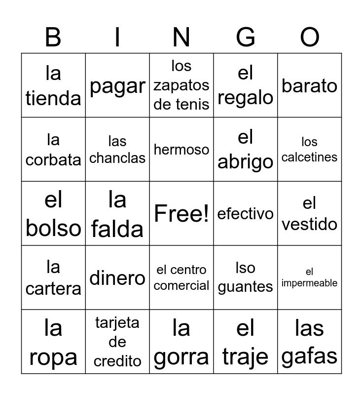 This bingo card has a free space and 24 words: dinero, tarjeta de credito, hermoso, la ropa, barato, la tienda, la corbata, pagar, efectivo, el centro comercial, el abrigo, el bolso, lso guantes, el impermeable, las chanclas, el traje, el vestido, los zapatos de tenis, los calcetines, la falda, las gafas, la cartera, el regalo and la gorra.