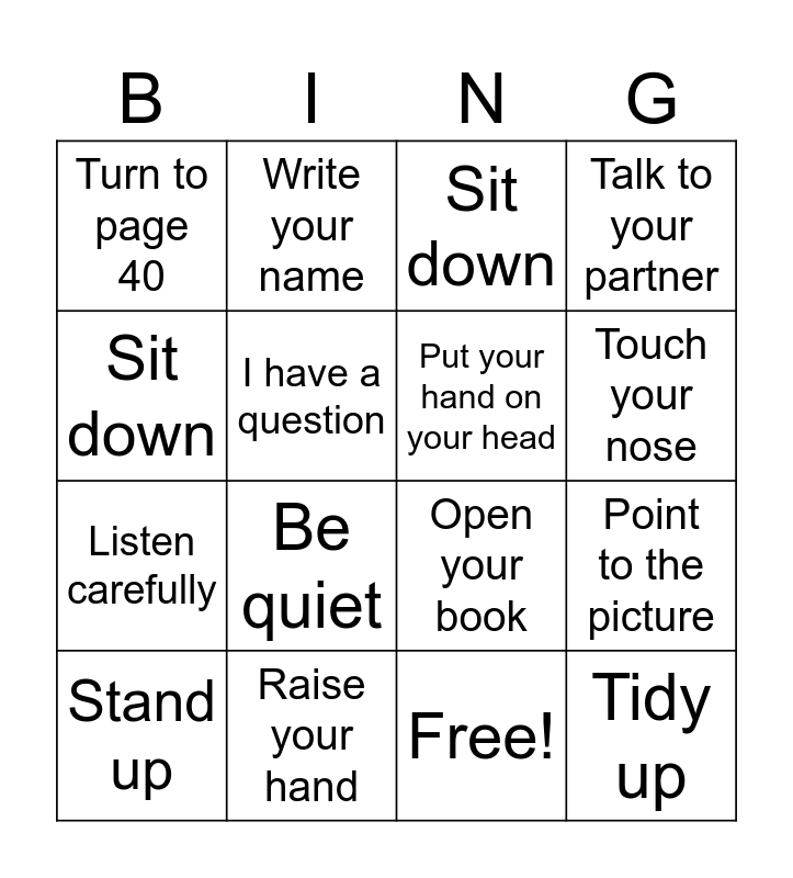 This bingo card has 17 words: Free!, Stand up, Sit down, Turn to page 40, Be quiet, Talk to your partner, Point to the picture, Put your hand on your head, Touch your nose, I have a question, Raise your hand, Open your book, Sit down, Write your name, Listen carefully, Please may I go to the toilet? and Tidy up.