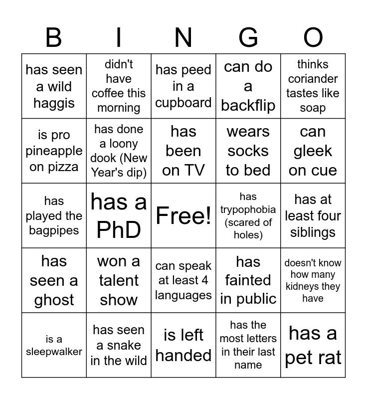 This bingo card has a free space and 24 words: won a talent show, has seen a snake in the wild, has been on TV, is a sleepwalker, thinks coriander tastes like soap, has seen a wild haggis, is pro pineapple on pizza, didn't have coffee this morning, has trypophobia (scared of holes), can speak at least 4 languages, wears socks to bed, has played the bagpipes, has fainted in public, doesn't know how many kidneys they have, has done a loony dook (New Year's dip), has the most letters in their last name, has at least four siblings, has peed in a cupboard, can gleek on cue, has a PhD, has a pet rat, has seen a ghost, can do a backflip and is left handed.