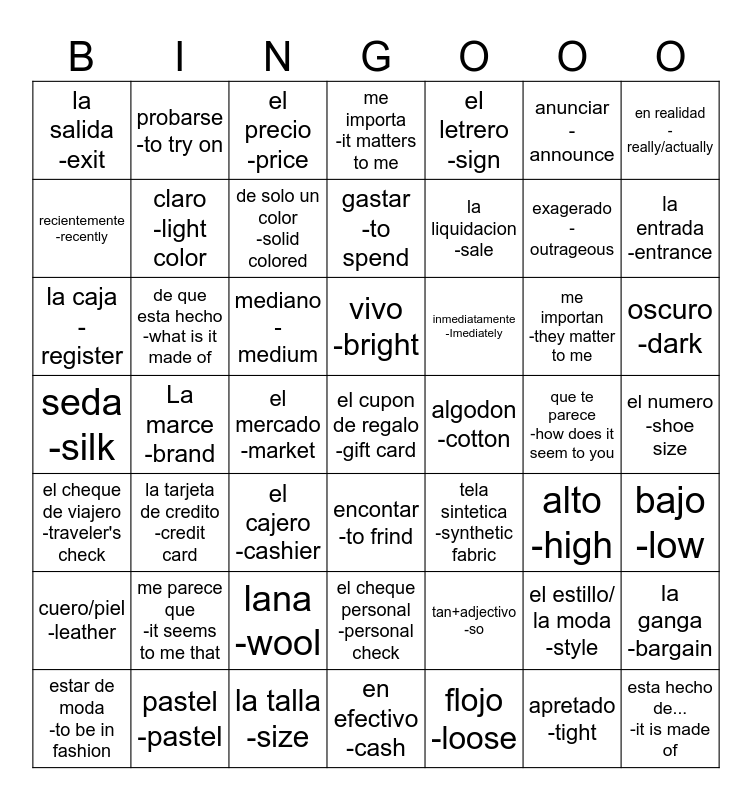 This bingo card has 49 words: el estillo/ la moda -style, exagerado -outrageous, flojo -loose, La marce -brand, mediano -medium, el numero -shoe size, probarse -to try on, la talla -size, anunciar -announce, encontar -to frind, en realidad -really/actually, me importa -it matters to me, me importan -they matter to me, inmediatamente -Imediately, me parece que -it seems to me that, que te parece -how does it seem to you, recientemente -recently, la entrada -entrance, la ganga -bargain, el letrero -sign, la liquidacion -sale, el mercado -market, la salida -exit, claro -light color, estar de moda -to be in fashion, de solo un color -solid colored, oscuro -dark, pastel -pastel, vivo -bright, de que esta hecho -what is it made of, esta hecho de... -it is made of, algodon -cotton, cuero/piel -leather, lana -wool, seda -silk, tela sintetica -synthetic fabric, alto -high, bajo -low, la caja -register, el cajero -cashier, el cheque personal -personal check, el cheque de viajero -traveler's check, el cupon de regalo -gift card, en efectivo -cash, gastar -to spend, el precio -price, tan+adjectivo -so, la tarjeta de credito -credit card and apretado -tight.
