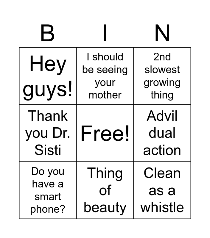 This bingo card has a free space and 8 words: Advil dual action, 2nd slowest growing thing, I should be seeing your mother, Do you have a smart phone?, Hey guys!, Clean as a whistle, Thank you Dr. Sisti and Thing of beauty.