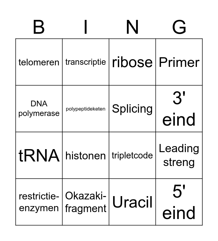 This bingo card has 36 words: DNA, mRNA, pre-mRNA, Splicing, nucleotide, 5' eind, 3' eind, helicase, DNA polymerase, DNA- ligase, Leading streng, Primer, Lagging steng, Okazaki-fragment, histonen, telomeren, PCR, gel-electroforese, restrictie-enzymen, ribose, Uracil, Thymine, exon, intron, translatie, transcriptie, tripletcode, anticodon, tRNA, polypeptideketen, ribosoom, Startcodon, Stopcodon, didesoxy-nucleotiden, repetitief DNA and RNA-polymerase.