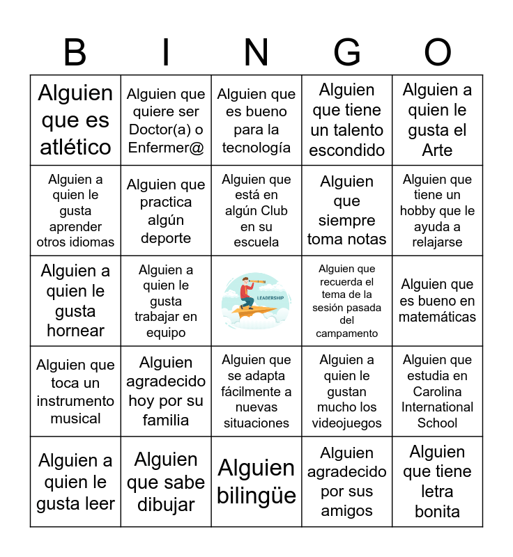 This bingo card has a free space and 24 words: Alguien agradecido hoy por su familia, Alguien que sabe dibujar, Alguien que está en algún Club en su escuela, Alguien a quien le gusta leer, Alguien a quien le gusta el Arte, Alguien que es atlético, Alguien a quien le gusta aprender otros idiomas, Alguien que quiere ser Doctor(a) o Enfermer@, Alguien que recuerda el tema de la sesión pasada del campamento, Alguien que se adapta fácilmente a nuevas situaciones, Alguien que siempre toma notas, Alguien a quien le gusta hornear, Alguien a quien le gustan mucho los videojuegos, Alguien que estudia en Carolina International School, Alguien que practica algún deporte, Alguien agradecido por sus amigos, Alguien que es bueno en matemáticas, Alguien que es bueno para la tecnología, Alguien que tiene un hobby que le ayuda a relajarse, Alguien a quien le gusta trabajar en equipo, Alguien que tiene letra bonita, Alguien que toca un instrumento musical, Alguien que tiene un talento escondido and Alguien bilingüe.