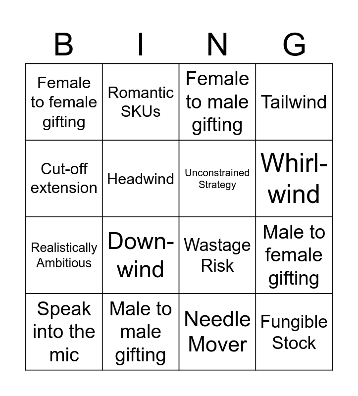 This bingo card has 16 words: Male to male gifting, Male to female gifting, Female to male gifting, Female to female gifting, Realistically Ambitious, Romantic SKUs, Wastage Risk, Needle Mover, Cut-off extension, Headwind, Speak into the mic, Tailwind, Down-wind, Whirl-wind, Unconstrained Strategy and Fungible Stock.