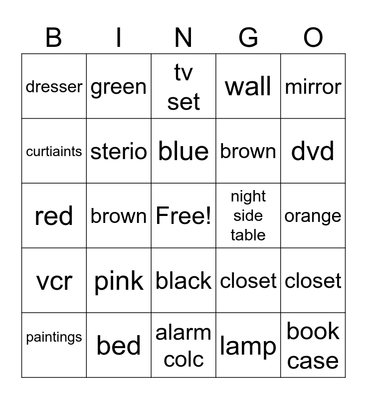 This bingo card has a free space and 24 words: pink, bed, blue, paintings, mirror, dresser, curtiaints, green, night side table, black, brown, red, closet, closet, sterio, lamp, orange, tv set, dvd, brown, book case, vcr, wall and alarm colc.