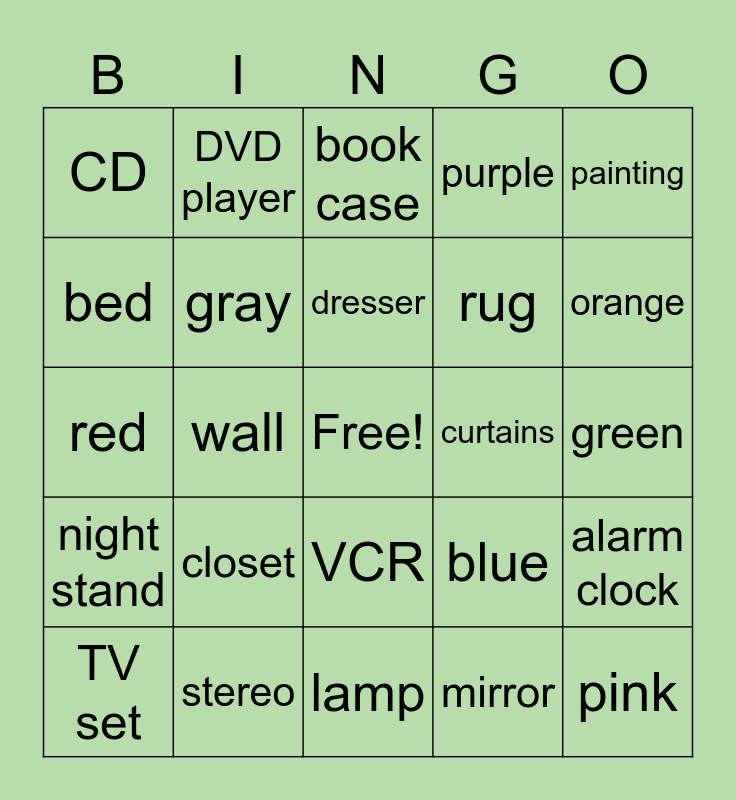 This bingo card has a free space and 24 words: closet, stereo, dresser, TV set, painting, CD, bed, DVD player, curtains, VCR, rug, red, blue, alarm clock, gray, mirror, green, book case, orange, wall, pink, night stand, purple and lamp.