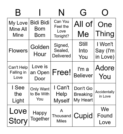 This bingo card has a free space and 24 words: Only Want to Be With You, Happy Together, Signed, Sealed, Delivered, Love Story, One Thing, My Love Mine All Mine, Flowers, Bidi Bidi Bom Bom, I'm a Believer, I Can't Help Myself, Still Into You, Can't Help Falling in Love, Don't Go Breaking My Heart, Accidentally in Love, Golden Hour, Cupid, Adore You, Can You Feel the Love Tonight?, I Won't Say (I'm in Love), Love is an Open Door, We Found Love, I See the Light, All of Me and A Thousand Miles.
