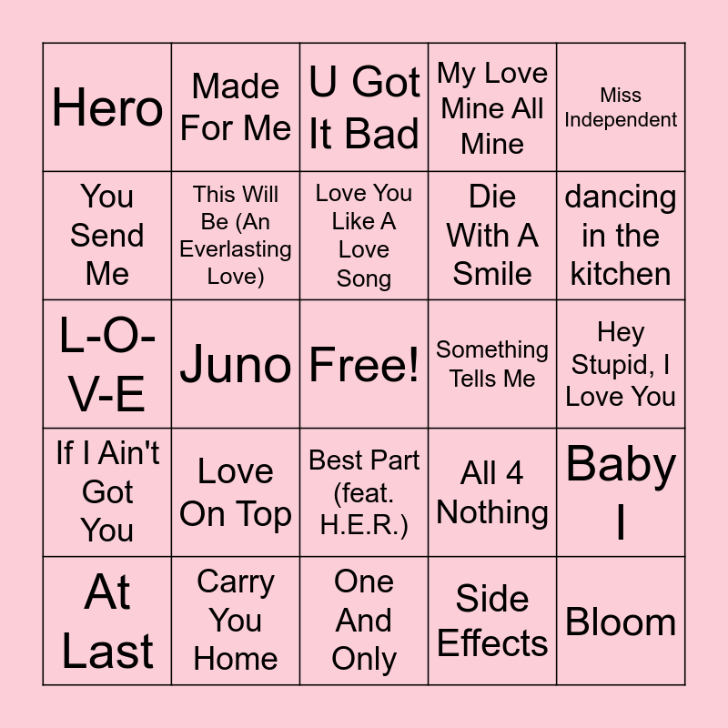 This bingo card has a free space and 75 words: Better, fOoL fOr YoU, U Got It Bad, All Your'n, Only Love, Me & U, My Girl, Are You Even Real (ft Giveon), Enchanted (Taylor's Version), Snooze, Kiss Mee, You're Still The One, Love You Like A Love Song, You Send Me, Nonsense, Juno, Love On The Brain, Bloom, Dive, Miss Independent, Dilemma, L-O-V-E, This Will Be (An Everlasting Love), Made For Me, My Love Mine All Mine, When I Look At You, Let Me Love You, The Kind of Love We Make, Forever After All, hate to be lame, Pancakes for Dinner, Golf On TV feat. JP Saxe, Love You Too, All 4 Nothing, dancing in the kitchen, Die With A Smile, if u want, Anyone, Hey Stupid, I Love You, Side Effects, Nervous, Lucky, Jackie and Wilson, Thinkin Bout You, Can't Take My Eyes off You, Fall Into Me, At Last, Hero, Don't Go Breaking My Heart, Crush, Get You (feat. Kali Uchis), Best Part (feat. H.E.R.), I Might Be In Love With You, Friday I'm in Love, Tennessee Whiskey, My Funny Valentine, Harry and Sally, Leave The Door Open, I'll Make Love To You, BIRDS OF A FEATHER, Love On Top, Crazy I Love (JAY-Z), PLASTIC OFF THE SOFA, Cloud 9, Can't Get Enough Of Your Love, Babe, Something Tells Me, I'm Fine, love language, Daydreamin', Baby I, If I Ain't Got You, Carry You Home, Head Over Feet, One And Only and Do For Love.