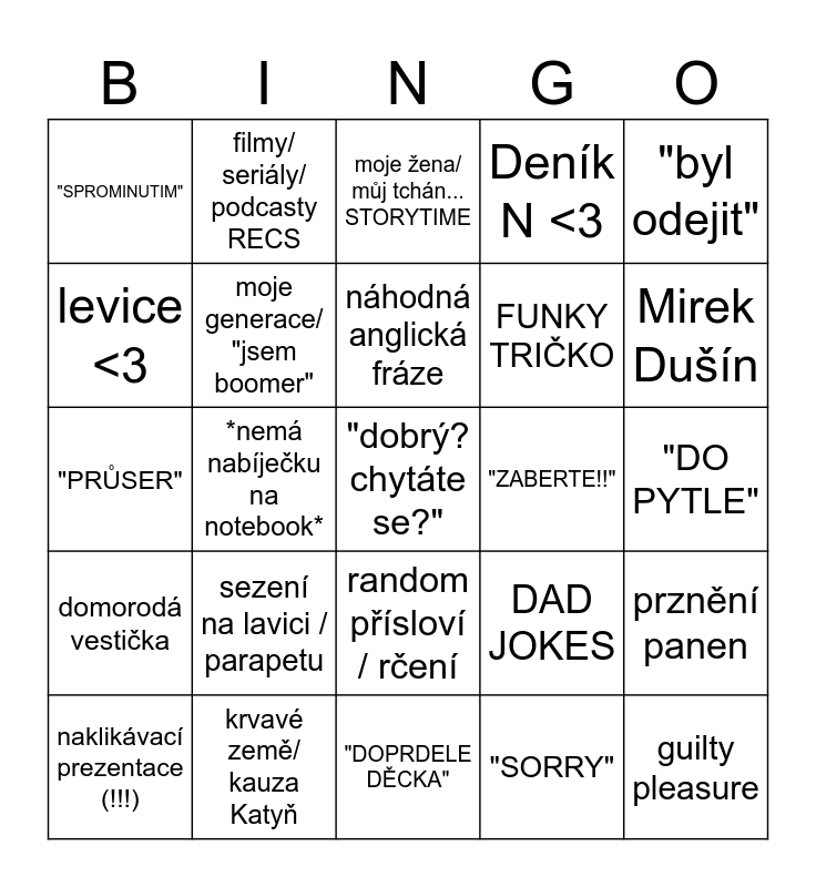 This bingo card has 25 words: sezení na lavici / parapetu, "DOPRDELE DĚCKA", náhodná anglická fráze, naklikávací prezentace (!!!), "byl odejit", "SPROMINUTIM", levice <3, filmy/ seriály/ podcasty RECS, "ZABERTE!!", random přísloví / rčení, FUNKY TRIČKO, "PRŮSER", DAD JOKES, prznění panen, moje generace/ "jsem boomer", guilty pleasure, "DO PYTLE", moje žena/ můj tchán... STORYTIME, Mirek Dušín, *nemá nabíječku na notebook*, "dobrý? chytáte se?", krvavé země/ kauza Katyň, domorodá vestička, Deník N <3 and "SORRY".