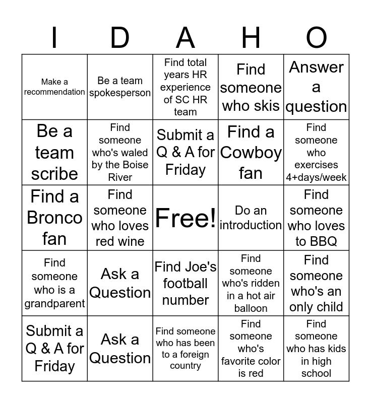 This bingo card has a free space and 24 words: Ask a Question, Ask a Question, Submit a Q & A for Friday, Submit a Q & A for Friday, Answer a question, Make a recommendation, Be a team scribe, Be a team spokesperson, Do an introduction, Find Joe's football number, Find a Cowboy fan, Find a Bronco fan, Find someone who's ridden in a hot air balloon, Find someone who's an only child, Find someone who's waled by the Boise River, Find someone who's favorite color is red, Find someone who loves to BBQ, Find total years HR experience of SC HR team, Find someone who exercises 4+days/week, Find someone who loves red wine, Find someone who has kids in high school, Find someone who is a grandparent, Find someone who skis and Find someone who has been to a foreign country.