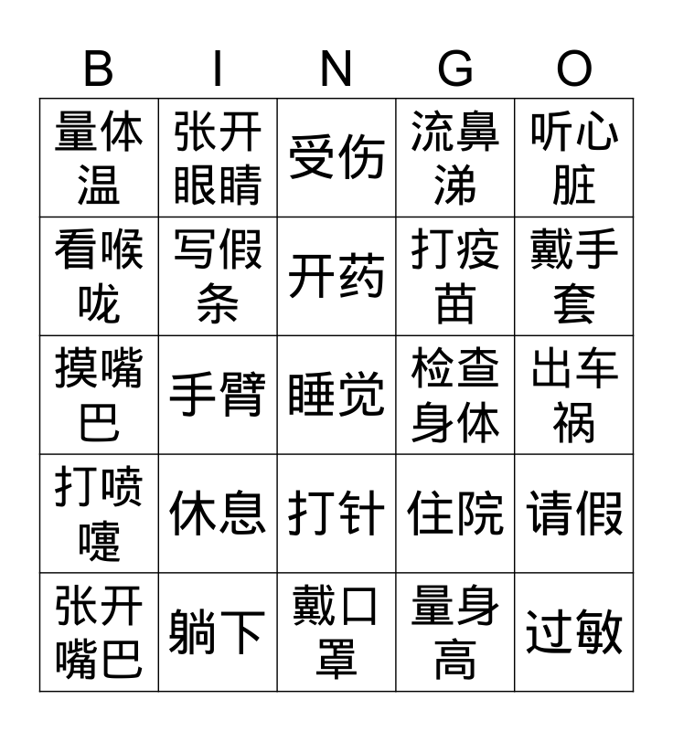 This bingo card has a free space and 24 words: 休息, 躺下, 开药, 张开嘴巴, 听心脏, 量体温, 看喉咙, 张开眼睛, 检查身体, 打针, 打疫苗, 摸嘴巴, 住院, 请假, 写假条, 量身高, 出车祸, 受伤, 戴手套, 手臂, 过敏, 打喷嚏, 流鼻涕 and 戴口罩.