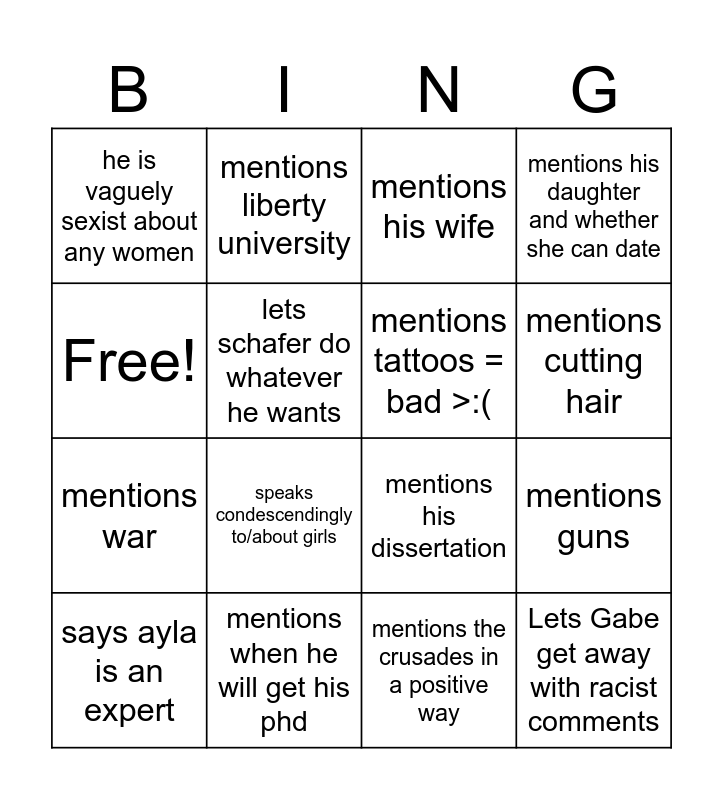 This bingo card has 16 words: mentions when he will get his phd, mentions guns, mentions his wife, he is vaguely sexist about any women, mentions war, mentions liberty university, mentions his dissertation, mentions the crusades in a positive way, Free!, lets schafer do whatever he wants, says ayla is an expert, mentions his daughter and whether she can date, speaks condescendingly to/about girls, mentions cutting hair, mentions tattoos = bad >:( and Lets Gabe get away with racist comments.