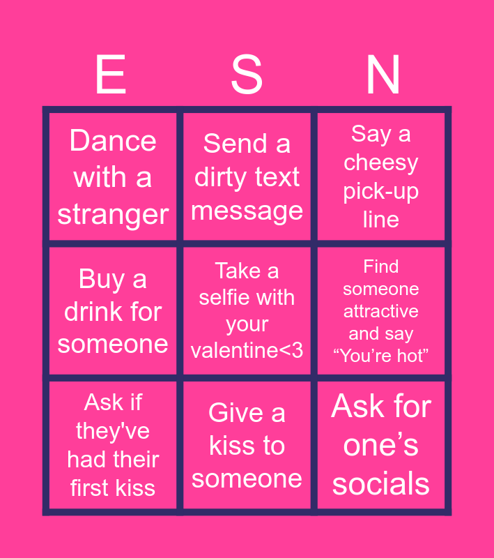 This bingo card has 9 words: Ask if they've had their first kiss, Say a cheesy pick-up line, Send a dirty text message, Buy a drink for someone, Dance with a stranger, Find someone attractive and say “You’re hot”, Take a selfie with your valentine<3, Ask for one’s socials and Give a kiss to someone.