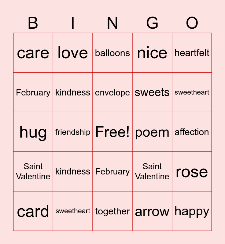 This bingo card has a free space and 76 words: affection, arrow, balloons, be mine, bighearted, bouquet, bow, candy, card, care, chocolate, compassion, envelope, February, flowers, friendship, gift, happy, heart, heartfelt, holiday, hug, kindness, love, nice, note, party, pink, poem, red, respect, romantic, rose, Saint Valentine, sweetheart, sweets, together, valentine, affection, arrow, balloons, be mine, bighearted, bouquet, bow, candy, card, care, chocolate, compassion, envelope, February, flowers, friendship, gift, happy, heart, heartfelt, holiday, hug, kindness, love, nice, note, party, pink, poem, red, respect, romantic, rose, Saint Valentine, sweetheart, sweets, together and valentine.
