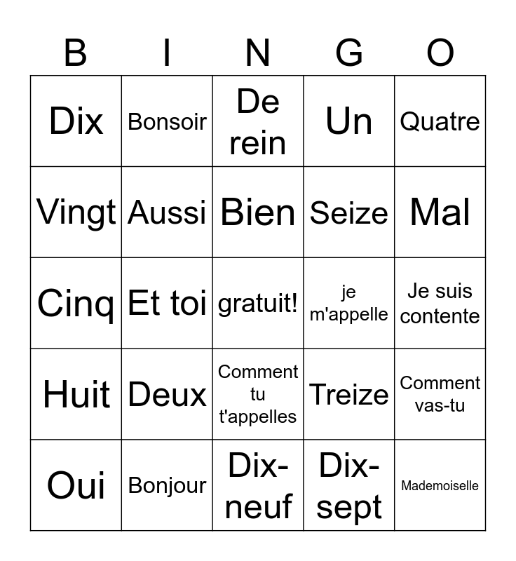 This bingo card has a free space and 24 words: Deux, Bonjour, Bien, Oui, Quatre, Dix, Vingt, Bonsoir, je m'appelle, Comment tu t'appelles, Seize, Cinq, Treize, Comment vas-tu, Aussi, Dix-sept, Je suis contente, De rein, Mal, Et toi, Mademoiselle, Huit, Un and Dix-neuf.
