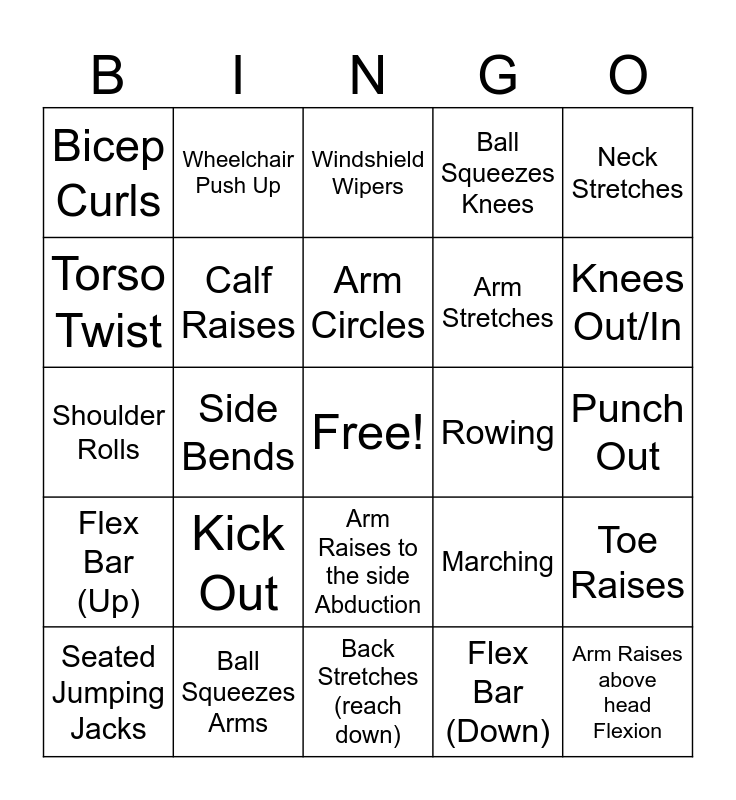This bingo card has a free space and 24 words: Kick Out, Ball Squeezes Arms, Arm Circles, Seated Jumping Jacks, Neck Stretches, Bicep Curls, Torso Twist, Wheelchair Push Up, Rowing, Arm Raises to the side Abduction, Arm Stretches, Shoulder Rolls, Marching, Toe Raises, Calf Raises, Flex Bar (Down), Punch Out, Windshield Wipers, Knees Out/In, Side Bends, Arm Raises above head Flexion, Flex Bar (Up), Ball Squeezes Knees and Back Stretches (reach down).