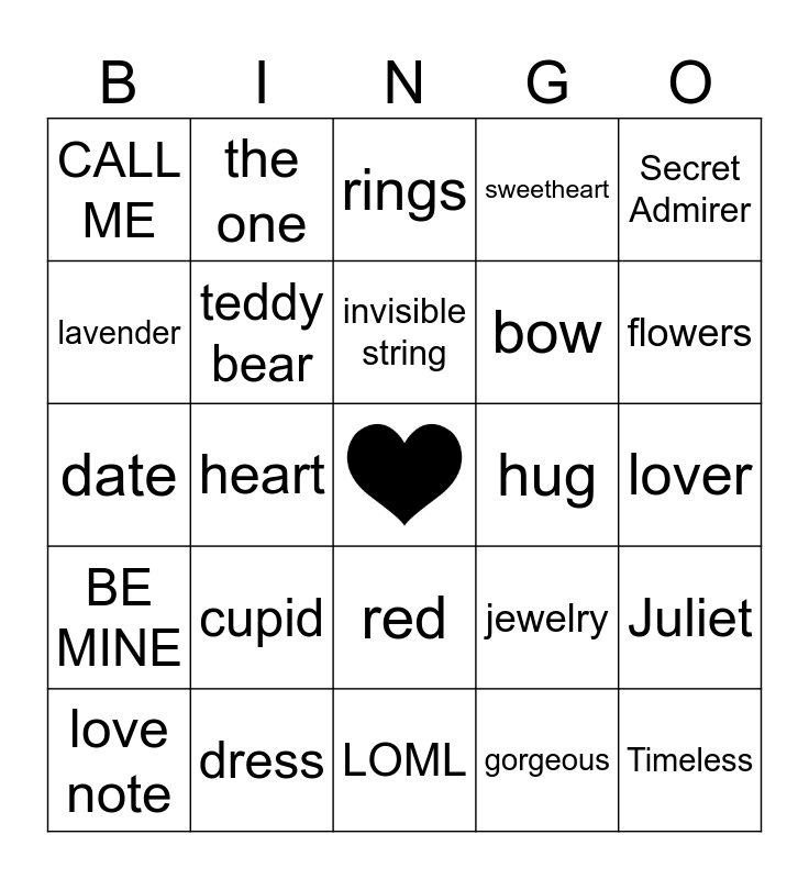 This bingo card has a free space and 50 words: valentine card, Timeless, love bug, LOML, cupid, chocolates, the one, TEXT ME, lavender, kiss, teddy bear, sweetheart, Juliet, jewelry, Starlight, Soulmate, invisible string, hug, Self Love, Secret Admirer, heart, gorgeous, CALL ME, bow, rose, Romeo, flowers, Feburary 14th, rings, red, fairytale, enchanted, puppy love, pink, dress, down bad, candy, candle, Paris, lover, dessert, delicate, love story, love song, love note, date, champagne, blush, BE MINE and arrow.