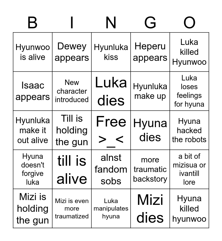 This bingo card has a free space and 24 words: till is alive, Mizi is even more traumatized, Luka dies, Mizi is holding the gun, Luka killed Hyunwoo, Hyunwoo is alive, Isaac appears, Dewey appears, Hyuna dies, alnst fandom sobs, Hyunluka make up, Hyunluka make it out alive, more traumatic backstory, a bit of mizisua or ivantill lore, New character introduced, Mizi dies, Hyuna hacked the robots, Hyunluka kiss, Luka loses feelings for hyuna, Till is holding the gun, Hyuna killed hyunwoo, Hyuna doesn't forgive luka, Heperu appears and Luka manipulates hyuna.