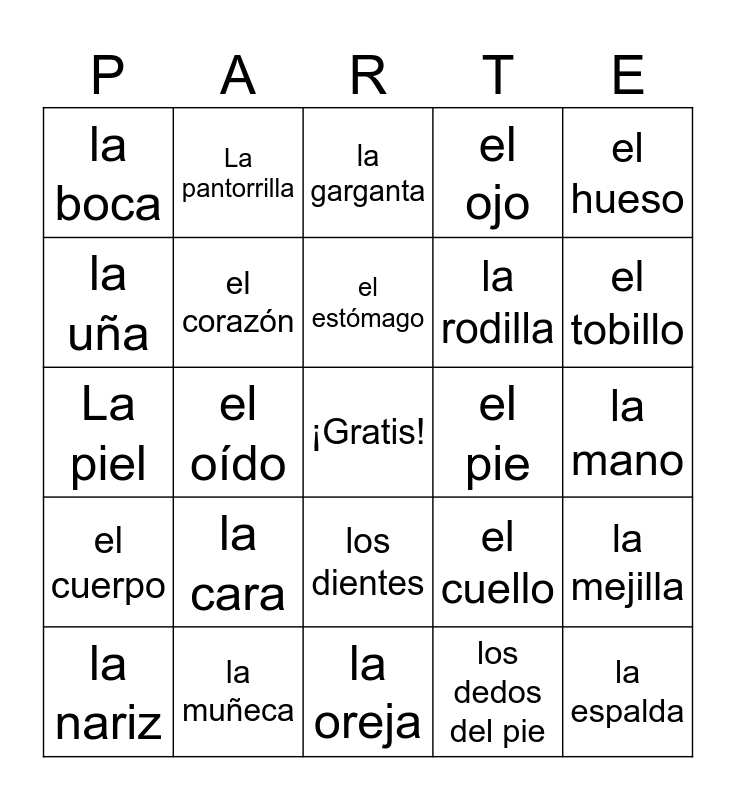 This bingo card has a free space and 36 words: el brazo, el cerebro, el codo, el corazón, el cuello, el cuerpo, el estómago, el hombro, el hueso, el muslo, el oído, el ojo, el pelo, el pie, el tobillo, la boca, la cabeza, la cara, la espalda, la garganta, la mano, la mejilla, la muñeca, la nariz, la oreja, La pantorrilla, La piel, la pierna, la rodilla, la uña, las cejas, los dedos, los dedos del pie, los dientes, los labios and los pulmones.