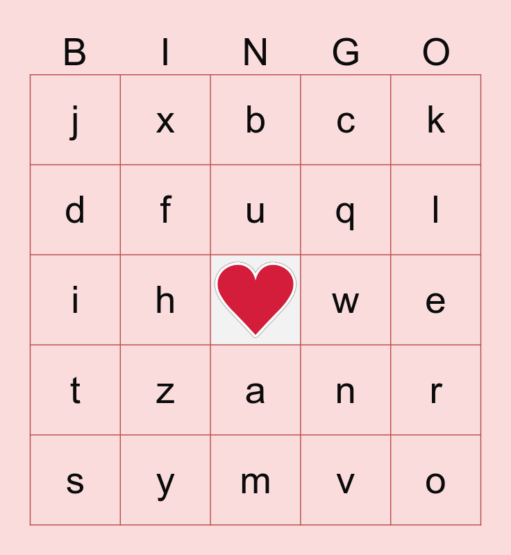 This bingo card has a free space and 26 words: a, v, u, y, k, j, d, x, e, n, q, i, r, s, h, p, c, t, b, o, l, m, w, z, f and g.