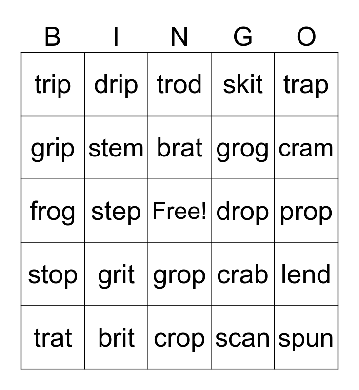 This bingo card has a free space and 24 words: grit, brit, brat, trat, trap, trip, grip, drip, drop, grop, grog, frog, crab, lend, stem, scan, prop, trod, cram, step, spun, stop, skit and crop.