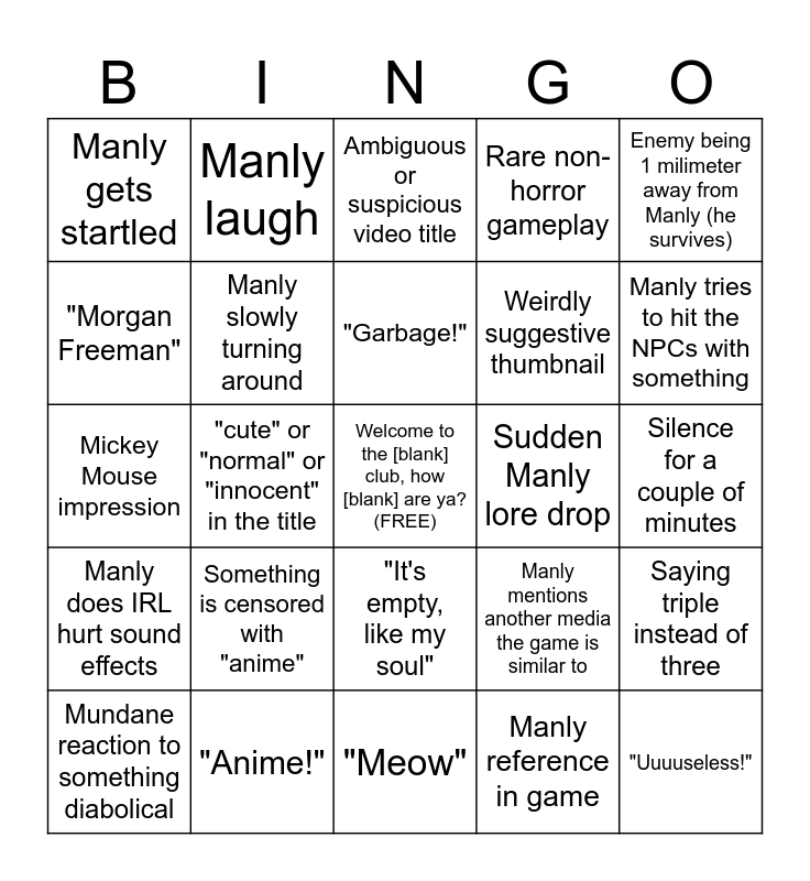 This bingo card has a free space and 26 words: "It's empty, like my soul", Manly reference in game, "Garbage!", "Anime!", Enemy being 1 milimeter away from Manly (he survives), Manly gets startled, "Morgan Freeman", Manly laugh, Silence for a couple of minutes, Manly mentions another media the game is similar to, Weirdly suggestive thumbnail, Mickey Mouse impression, Saying triple instead of three, Mundane reaction to something diabolical, "cute" or "normal" or "innocent" in the title, Instantly tries to get the bad ending first, Rare non-horror gameplay, Manly does IRL hurt sound effects, Ambiguous or suspicious video title, "Uuuuseless!", Manly tries to hit the NPCs with something, "Meow", Sudden Manly lore drop, Something is censored with "anime", Manly slowly turning around and "It's you, you look good".