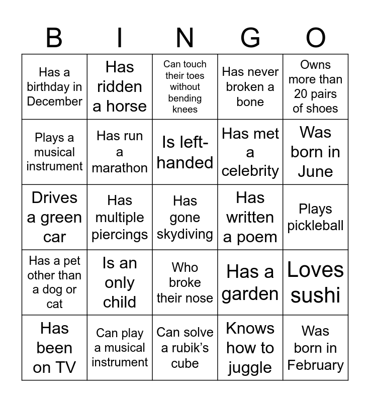 This bingo card has 58 words: Has traveled to another continent, Can play a musical instrument, Has been to a concert in the last month, Has a pet other than a dog or cat, Knows how to juggle, Speaks more than two languages, Has run a marathon, Is the youngest sibling, Has met a celebrity, Loves gardening, Has never broken a bone, Can whistle loudly, Prefers tea over coffee, Loves to dance, Is an only child, Has a birthday in December, Has gone skydiving, Owns more than 20 pairs of shoes, Hates pizza, Is left-handed, Has written a poem, Can touch their toes without bending knees, Has been on TV, Loves sushi, Does yoga, Plays pickleball, Has a younger brother, Is left handed, Was born in June, Has an older sister, Can speak another language, Plays football, Has been to 3 continents, Can change a tire, Is wearing contact lenses, Has gotten pulled over in the last month, A female who Doesn’t have their ears pierced, Has multiple piercings, Drives a green car, Drives a red car, Is an only child, Was born in February, Has a garden, Never been on a cruise, Loves to play video games, Has been married over 25 years, Who is a twin, Who broke their nose, Can solve a rubik’s cube, Who loves roller coasterswho has a collection of something, Who doesn’t have facebook, Who is scared of spiders, Who is scared of heights, Has a pet cat, Has ridden a horse, Has made a YouTube video, Plays a musical instrument and Has written a blog.
