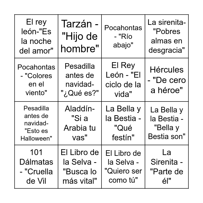 This bingo card has 32 words: Blanca Nieves y los Siete Enanitos - "Ay-Ho", La Bella Durmiente - "Eres tú mi príncipe azul", La Bella y la Bestia - "Bella y Bestia son", Aladdín - "Un mundo ideal", La Sirenita - "Parte de él", El Rey León - "El ciclo de la vida", Pocahontas - "Colores en el viento", La Sirenita - "Bajo el mar", Tarzán - "Hijo de hombre", Frozen - "¡Suéltalo!, Hércules - "De cero a héroe", Pocahontas - "Río abajo", El rey león-"Voy a ser el rey león", Alicia en el País de las Maravillas - "Feliz no cumpleaños", El Libro de la Selva - "Busca lo más vital", Mulan - "Mi reflejo", Blanca Nieves y los Siete Enanitos - "Algún día mi príncipe vendrá", La Bella y la Bestia - "Qué festín", Aladdín - "Príncipe Alí", El Rey León - "Hakuna Matata", Hércules - "No importa la distancia", Mulan-"Todo un hombre haré de ti", El Libro de la Selva - "Quiero ser como tú", Aladdín - "Un genio tan genial", 101 Dálmatas - "Cruella de Vil, La sirenita- "Pobres almas en desgracia", Pesadilla antes de navidad- "Esto es Halloween", Pesadilla antes de navidad-"¿Qué es?", El rey león-"Es la noche del amor", La Sirenita-"Bésala", La bella y la bestia-"Gastón" and Aladdín-"Si a Arabia tu vas".