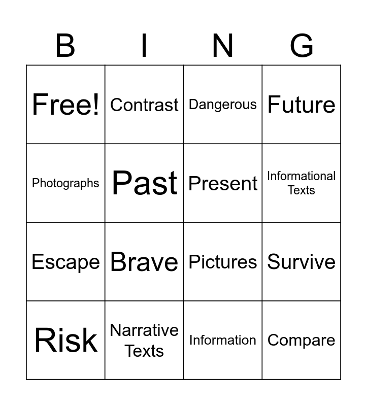 This bingo card has 16 words: Risk, Narrative Texts, Dangerous, Future, Photographs, Contrast, Pictures, Survive, Free!, Past, Information, Informational Texts, Escape, Brave, Present and Compare.