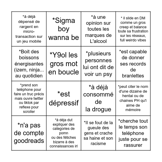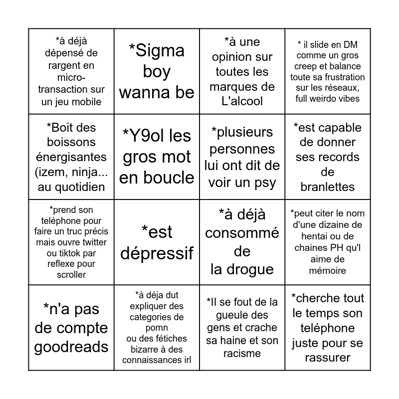 This bingo card has 16 words: *à déja dut expliquer des categories de pomn ou des fétiches bizarre à des connaissances irl, *peut citer le nom d'une dizaine de hentai ou de chaines PH qu'l aime de mémoire, *à une opinion sur toutes les marques de L'alcool, *à déjà dépensé de rargent en micro- transaction sur un jeu mobile, *prend son teléphone pour faire un truc précis mais ouvre twitter ou tiktok par reflexe pour scroller, *Sigma boy wanna be, *à déjà consommé de la drogue, *II se fout de la gueule des gens et crache sa haine et son racisme, *Boit des boissons énergisantes (izem, ninja... au quotidien, *Y9ol les gros mot en boucle, *n'a pas de compte goodreads, * il slide en DM comme un gros creep et balance toute sa frustration sur les réseaux, full weirdo vibes, *est dépressif, *est capable de donner ses records de branlettes, *plusieurs personnes lui ont dit de voir un psy and *cherche tout le temps son teléphone juste pour se rassurer.