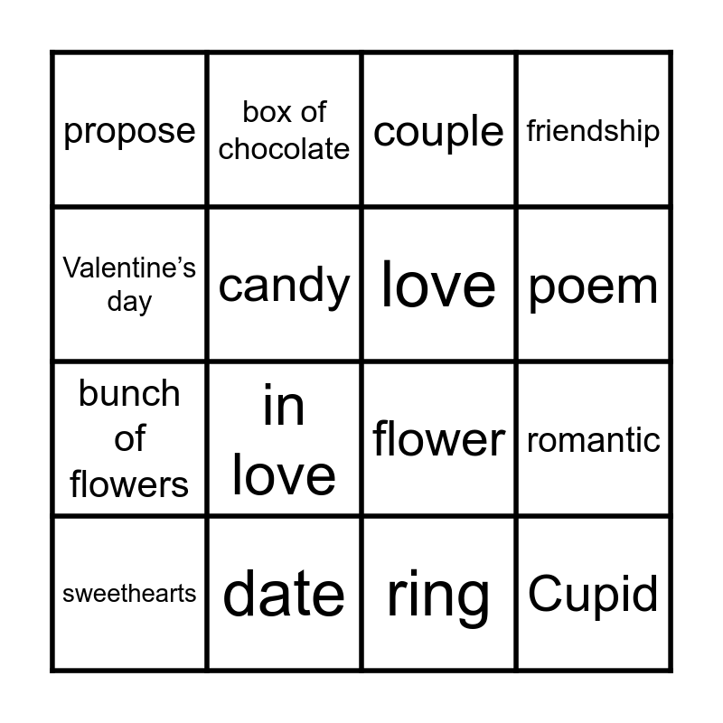 This bingo card has 27 words: bow and arrow, balloons, bunch of flowers, cake, candy, couple, box of chocolate, Cupid, date, engagement, flower, friendship, heart, hug me, in love, kiss, love, poem, present/gift, propose, ring, rose, romantic, sweethearts, Valentine's card, Valentine’s day and wedding ring.