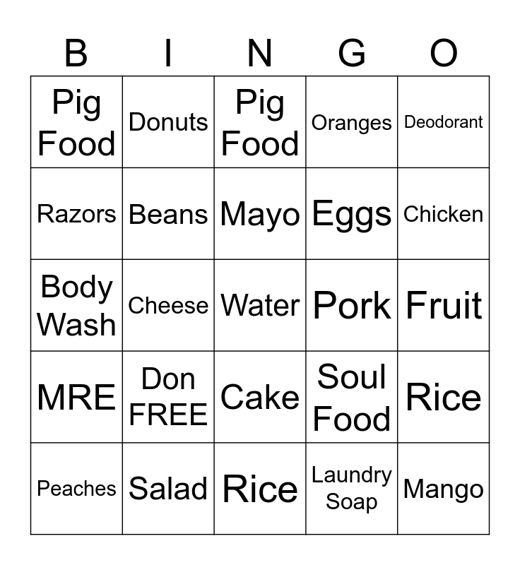 This bingo card has a free space and 24 words: Don FREE, Salad, Mayo, Peaches, Deodorant, Pig Food, Razors, Donuts, Pork, Cake, Eggs, Body Wash, Soul Food, Rice, Beans, Laundry Soap, Fruit, Pig Food, Chicken, Cheese, Mango, MRE, Oranges and Rice.