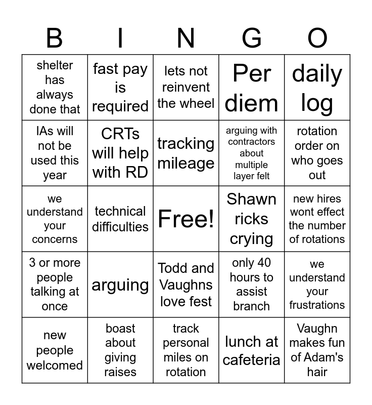 This bingo card has a free space and 24 words: new people welcomed, arguing, tracking mileage, lunch at cafeteria, daily log, shelter has always done that, fast pay is required, lets not reinvent the wheel, Shawn ricks crying, new hires wont effect the number of rotations, we understand your concerns, CRTs will help with RD, only 40 hours to assist branch, we understand your frustrations, IAs will not be used this year, boast about giving raises, track personal miles on rotation, Per diem, rotation order on who goes out, 3 or more people talking at once, technical difficulties, Todd and Vaughns love fest, arguing with contractors about multiple layer felt and Vaughn makes fun of Adam's hair.