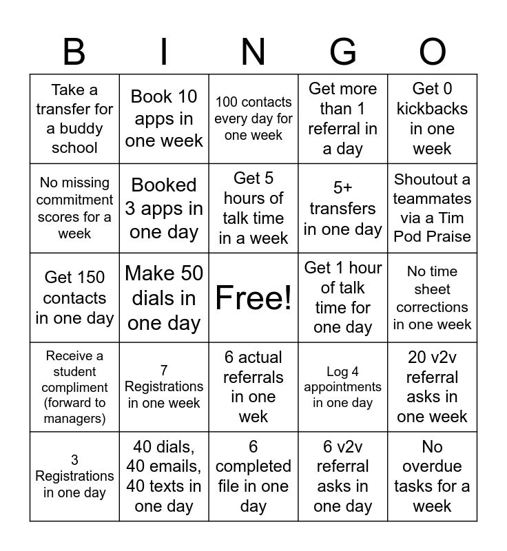 This bingo card has a free space and 24 words: 7 Registrations in one week, 40 dials, 40 emails, 40 texts in one day, Get 5 hours of talk time in a week, 3 Registrations in one day, Get 0 kickbacks in one week, Take a transfer for a buddy school, No missing commitment scores for a week, Book 10 apps in one week, Get 1 hour of talk time for one day, 6 actual referrals in one wek, 5+ transfers in one day, Get 150 contacts in one day, Log 4 appointments in one day, 20 v2v referral asks in one week, Booked 3 apps in one day, 6 v2v referral asks in one day, No time sheet corrections in one week, 100 contacts every day for one week, Shoutout a teammates via a Tim Pod Praise, Make 50 dials in one day, No overdue tasks for a week, Receive a student compliment (forward to managers), Get more than 1 referral in a day and 6 completed file in one day.