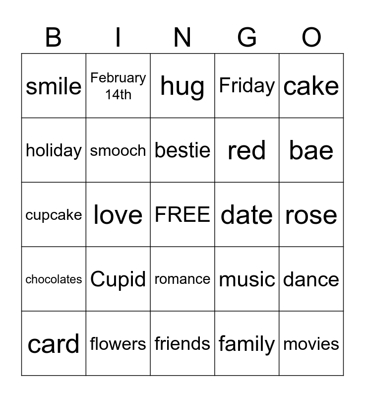 This bingo card has a free space and 29 words: card, heart, love, candy, smile, hug, smooch, Cupid, date, flowers, rose, movies, friends, family, bae, hold hands, romance, chocolates, cake, cupcake, music, pink, red, holiday, Friday, February 14th, dance, bestie and love you!.