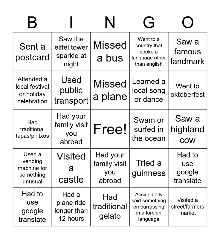 This bingo card has a free space and 85 words: Missed a plane, Missed a train, Missed a bus, Got lost in home city, Got lost in traveling city, Had a plane ride longer than 12 hours, Went to a country that spoke a language other than english, Lived in an apartment, Lived in a homestay, Lived in a dorm, Stayed up all night, Became friends with a local, Used public transport, Swam or surfed in the ocean, Saw a famous landmark, Sent a postcard, Had to use google translate, Attended a local festival or holiday celebration, Tried a food or drink you were scared of, Took a boat or ferry as transportation, Packed all your clothes for a trip in a backpack, Learned a local song or dance, Visited a street/farmers market, Cooked a meal in a foreign country, Had your family visit you abroad, Accidentally said something embarrassing in a foreign language, Had afternoon tea, tapas, or traditional small meal experience, Took a class in another language, Saw a kangaroo or a koala in the wild, Saw a highland cow, Visited a castle, Got caught in the rain without an umbrella, Tried a guinness, Had traditional tapas/pintxos, Saw the sagrada familia basilica, Threw a coin in the trevi fountain, Had traditional gelato, Visited a temple or shrine, Used a vending machine for something unusual, Went to oktoberfest, ‘Cheersed’ in another language, Ate a locally made pastry, Saw the eiffel tower sparkle at night, Threw a coin in the trevi fountain, Had traditional gelato, Visited a temple or shrine, Used a vending machine for something unusual, Went to oktoberfest, ‘Cheersed’ in another language, Ate a locally made pastry, Saw the eiffel tower sparkle at night, Missed a plane, Missed a train, Missed a bus, Got lost in home city, Got lost in traveling city, Had a plane ride longer than 12 hours, Went to a country that spoke a language other than english, Lived in an apartment, Lived in a homestay, Lived in a dorm, Stayed up all night, Became friends with a local, Used public transport, Swam or surfed in the ocean, Saw a famous landmark, Sent a postcard, Had to use google translate, Attended a local festival or holiday celebration, Tried a food or drink you were scared of, Took a boat or ferry as transportation, Packed all your clothes for a trip in a backpack, Learned a local song or dance, Visited a street/farmers market, Cooked a meal in a foreign country, Had your family visit you abroad, Accidentally said something embarrassing in a foreign language, Had afternoon tea, tapas, or traditional small meal experience, Took a class in another language, Saw a kangaroo or a koala in the wild, Saw a highland cow, Visited a castle, Got caught in the rain without an umbrella, Tried a guinness and Saw the sagrada familia basilica.