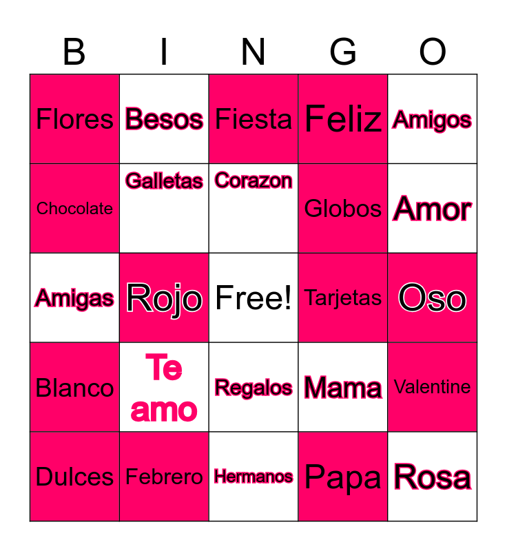 This bingo card has a free space and 24 words: Te amo, Febrero, Corazon, Dulces, Amigos, Flores, Chocolate, Besos, Tarjetas, Regalos, Globos, Amigas, Mama, Valentine, Galletas, Papa, Oso, Fiesta, Amor, Rojo, Rosa, Blanco, Feliz and Hermanos.