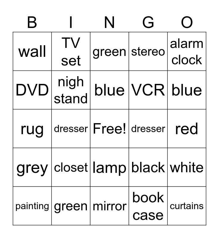 This bingo card has a free space and 24 words: closet, green, blue, painting, alarm clock, wall, DVD, TV set, dresser, lamp, VCR, rug, black, white, nigh stand, book case, red, green, blue, dresser, curtains, grey, stereo and mirror.