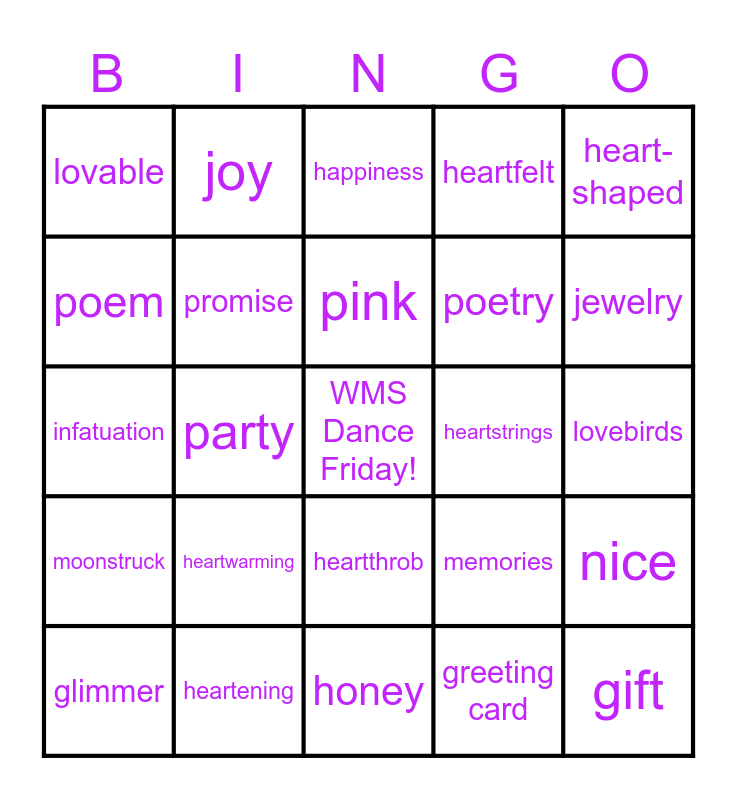 This bingo card has a free space and 45 words: gentleman, gift, girlfriend, glimmer, glitter, greeting card, happiness, happy, heart-shaped, heartening, heartfelt, heartstrings, heartthrob, heartwarming, holiday, honey, hug, infatuation, infectious, jewelry, joy, kindness, long-stemmed roses, lovable, love, lovebirds, lovesick, mate, memories, moonstruck, mysterious, nice, note, one and only, optimistic, party, passion, perfume, petals, pink, poem, poetry, presents, promise and proposal.